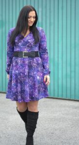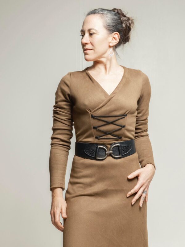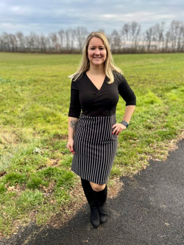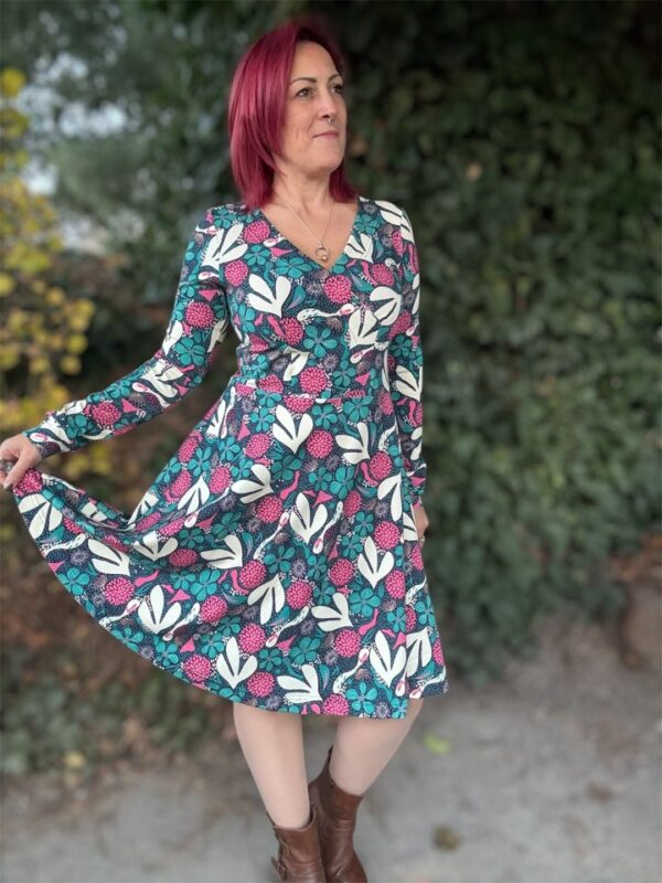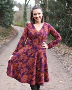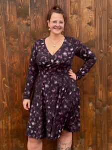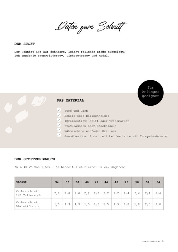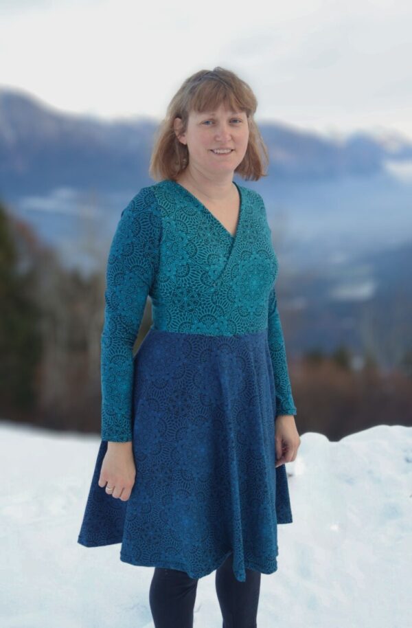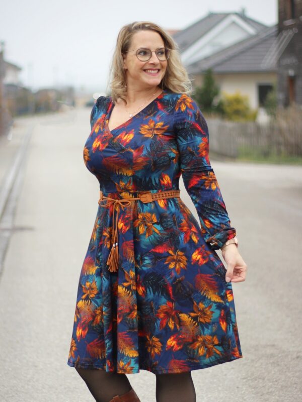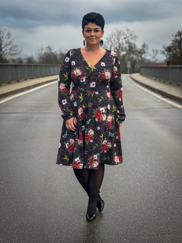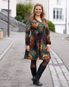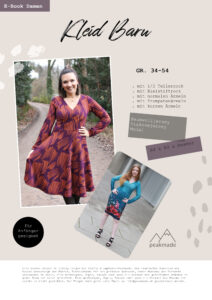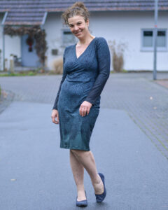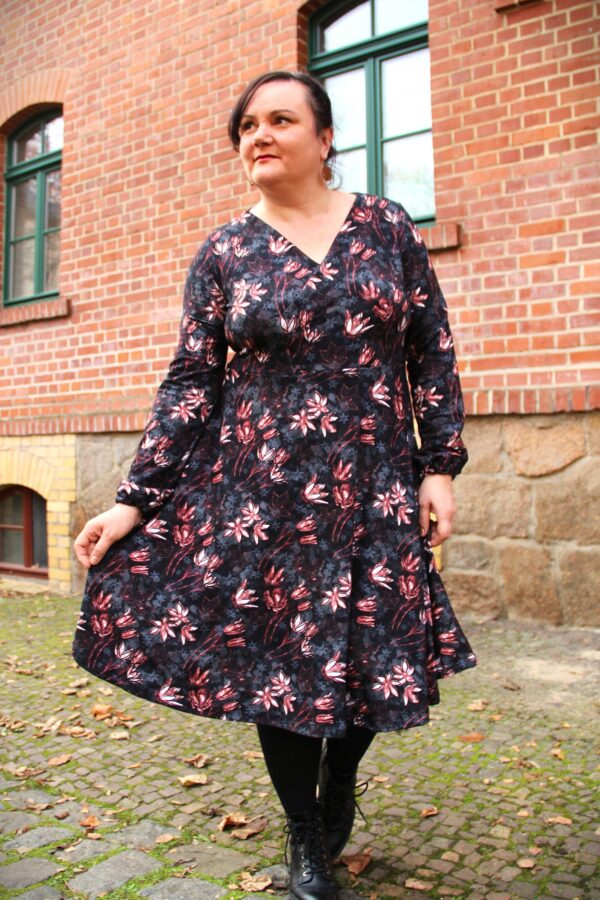 Dieses Schnittmuster verbindet feminine Eleganz mit angenehmem Tragekomfort. Ein schmeichelnder V-Ausschnitt, lange Ärmel und die Wahl zwischen halbem Tellerrock oder figurbetontem Bleistiftrock machen das Kleid zu einem vielseitigen Begleiter für Alltag und besondere Anlässe. Genäht aus elastischen Stoffen fällt es weich, sitzt bequem und lässt sich ganz nach deinem Stil interpretieren – romantisch schwingend oder klassisch und klar.